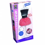 Пластиковый манекен, набор английских булавок (40 шт.), джинсовая ткань, клетчатая ткань, катушка швейных ниток (9 м), катушка вышивальных ниток (9 м), игла, 2 застежки-липучки, выкройки, эскизы